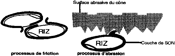 Chaque morçeau va subir un frottement (abrasion) dans la machine et donnera plus de farine de riz évacuée avec le son! (un rizier tentera toujours de limiter ces pertes en évitant de casser les grains)