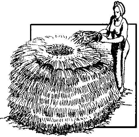 Placer les gerbes liées en rond, les panicules vers LE CENTRE DE LA MEULE. Laisser une aération au centre de la meule. Les gerbes doivent être bien rangées dans le même sens et non en zig-zag!