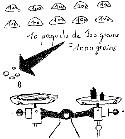5. Comptez 1000 grains avec patience: comptez 10 paquets de 100 grains pour en faire 1000.Mélanger les 10 paquets et les placer sur la balance.