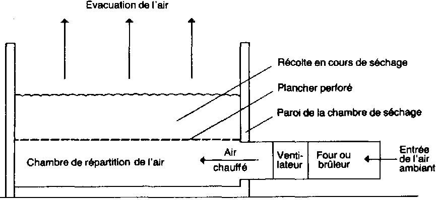 Un ventilateur propulse l'air à travers les grains étalés sur le plancher perforé. En principe, l'air est chauffé avant de passer à travers le produit. Une fois séchées, les céréales sont enlevées, refroidies, puis entreposées. Ce système permet un séchage rapide, mais sa construction coûte cher. Il exige également du matériel qui n'est pas toujours à la portée des agriculteurs. En outre, il faut compter l'achat du combustible qui fera fonctionner le ventilateur et les frais d'entretien du matériel. Il existe de nombreux exemples de ce type de séchoir. La figure 6.10 en donne une illustration.