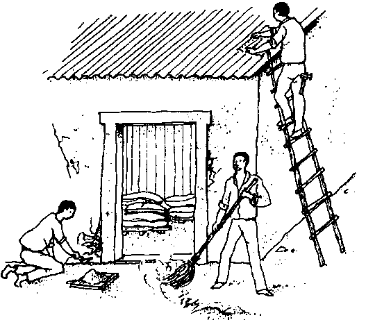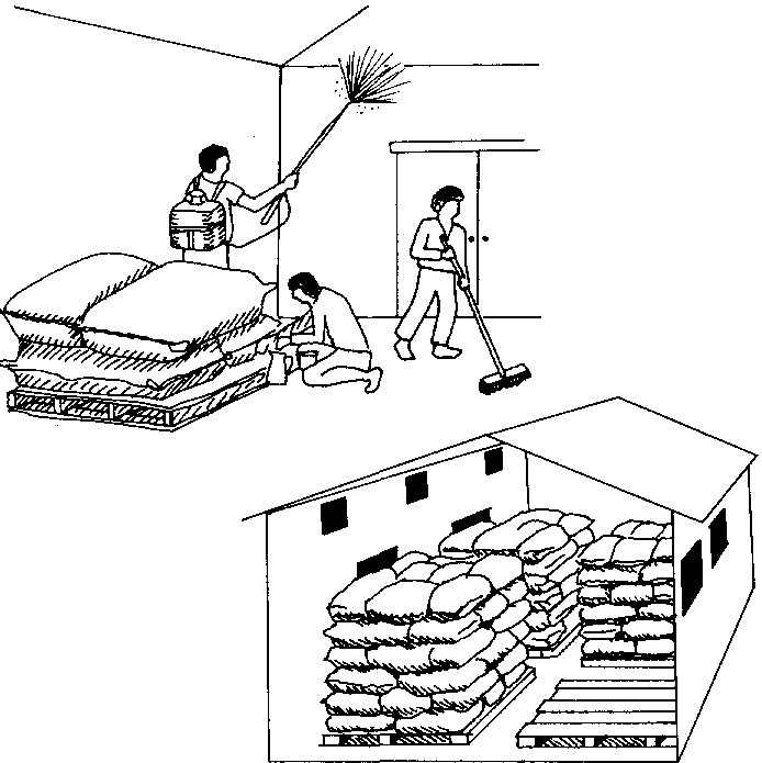 La pulvérisation ou le poudrage d'insecticides sur des couches de sacs successives (fig. 7.9) présentent moins de danger pour l'homme, mais ne sont pas toujours efficaces. Toutefois, on a constaté dernièrement que le pirimiphos-méthyl (en concentré émulsifiable - Actellic SO ce), appliqué non dilué (50 ce) à raison de deux à trois projections par sac au moyen d'un simple pulvérisateur domestique, a pratiquement éliminé les charançons de sacs de mals très infestés et que la population était encore très réduite même huit mois plus tard. Mais il est toujours risqué d'employer des insecticides non dilués.