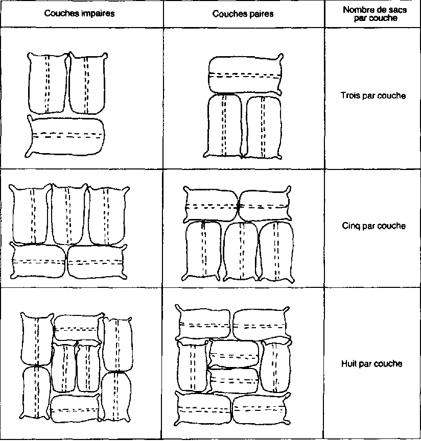 Les sacs sont généralement empilés par couches de trois, cinq ou huit sacs. La figure 7.7 montre comment on organise les couches paires et impaires.