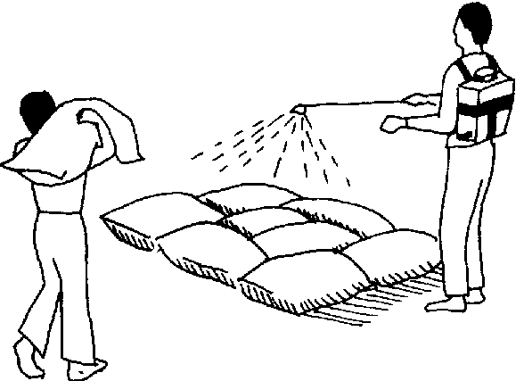 Finalement, la méthode la plus satisfaisante pour éliminer et combattre les insectes dans les sacs de grain est la fumigation. Elle consiste à libérer un gaz parmi les sacs recouverts d'une bâche étanche aux gaz, maintenue contre le sol par des boudins de sable ou par une grosse chaîne gainée de toile d'emballage (fig. 7.10). On garde la pile ainsi bâchée pendant au moins trois jours.
