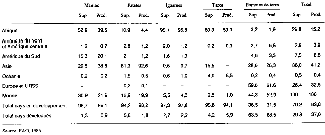 Selon une estimation récente de la FAO, pratiquement tous les pays du monde cultivent des plantes-racines. La plupart de celles qui sont examinées dans cette étude ont besoin d'un climat tropical et sont limitées à l'Afrique, l'Asie et l'Amérique latine. Seules pommes de terre et quelques variétés de patates sont cultivées en grandes quantités dans la zone tempérée. Ces racines constituent souvent l'aliment de base principal des consommateurs à faible revenu. Les paysans les cultivent pour leur propre subsistance sur de petites superficies allant de 2 à 20 ha, selon la région.