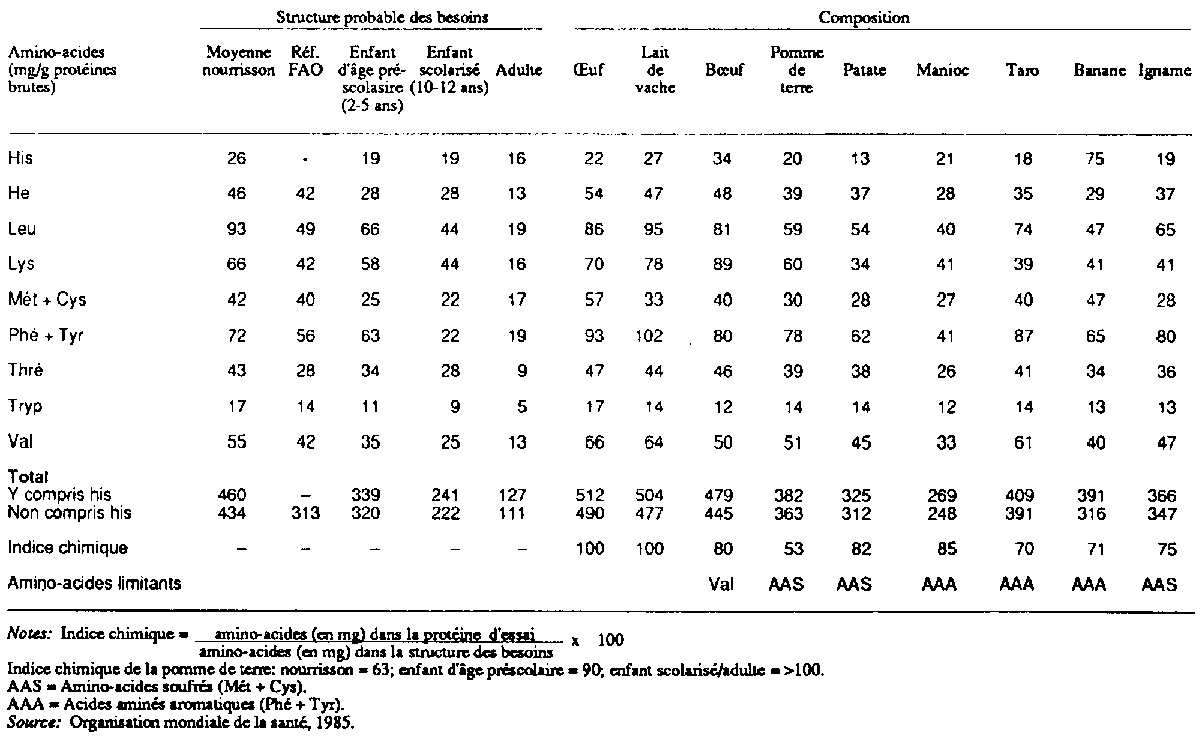 Dans les plantes-racines, la qualité des protéines, quant à leur composition en acides aminés essentiels, peut être comparée à celle des protéines animales courantes dans la viande de boeuf, les ceufs ou le lait (tableau 4.5). Les plantes-racines contiennent généralement une bonne quantité de lysine, moins toutefois que les légumineuses, mais les acides aminés soufrés sont insuffisants. Par exemple, l'igname est riche en phénylalanine et en thréonine mais pauvre en acides aminés soufrés, en cystine, méthionine et tryptophane.