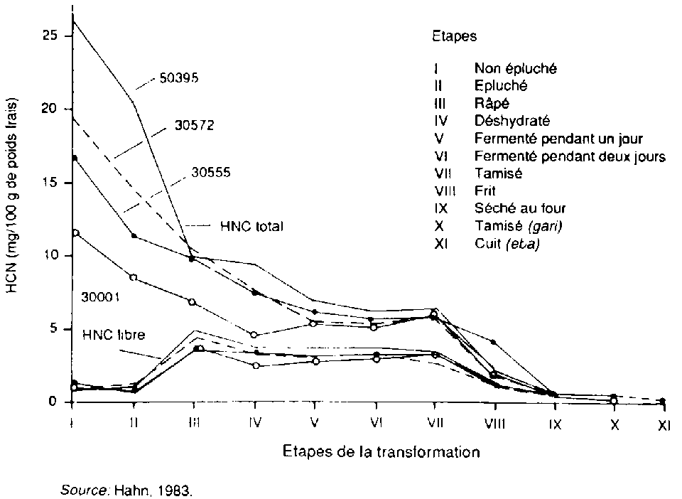 L'acide cyanhydrique (HCN) est un composé volatil. Il s'évapore rapidement dans l'air à des températures supérieures à 28 °C et se dissout facilement dans l'eau. Il peut aisément être perdu durant le transport, l'entreposage et l'analyse des échantillons. La teneur normale en cyanogène des tubercules demanioc se situe normalement entre 15 et 400mg de HCN/kg de poids frais(Coursey,1973). La concentration varie largement entre les variétés (fig. 7.1) de même qu'avec les conditions écologiques et culturelles. La concentration des glycosides cyanogénétiques augmente du centre vers la périphérie du tubercule (Bruijn, 1973). Généralement, la teneur en cyanure est beaucoup plus élevée dans la peau du manioc. Le goût amer n'indique pas avec certitudè la présence de cyanure.