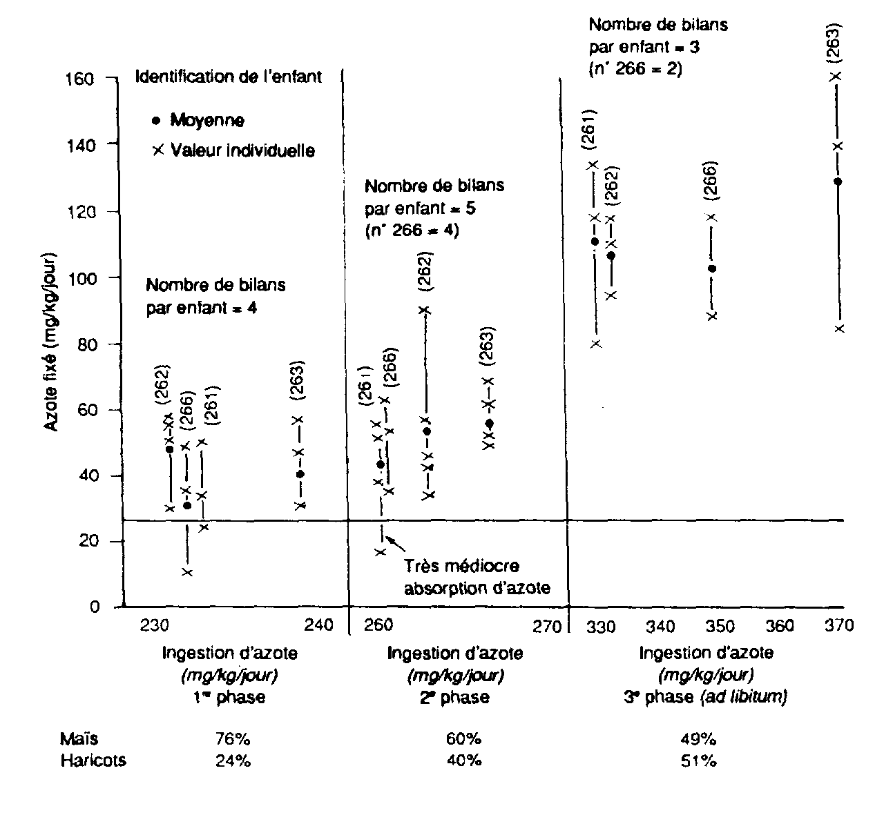 La grande importance de la qualité des protéines a échappé à ceux qui assurent que, dans les régimes alimentaires, l'énergie est plus limitante que les protéines. L'effet de complément mentionné ci-dessus a également été décrit chez les humains. Le bilan azoté a été expérimenté dans des études concernant des enfants nourris au mais traité à la chaux et aux haricots, selon deux proportions fixes et une troisième ad libitum, au choix des enfants (figure 6). Le bilan azoté obtenu avec la proportion fixe de la phase1(76:24) était inférieur à celui obtenu lorsque la proportion du maïs par rapport aux haricots dans le régime alimentaire était de 60:40 (phase 2). Le bilan azoté s'améliorait lorsque les enfants étaient laissés libres de choisir, et leur choix approchait de sept parts de maïs pour trois parts de haricots en poids. Tout aussi important est le fait que l'ingestion totale d'aliments augmentait également. L'ingestion habituelle de maïs et de haricots, établie par des enquêtes alimentaires remontant aux années 60, variait entre 11:1 et 18: 1; la supplémentation en haricots était donc relativement faible. Des données plus récentes (Garcia et Urrutia, 1978) concernant des enfants de trois ans ont montré un rapport de 8:4 entre le mais et les haricots, et le rapport était encore plus faible chez les enfants de 6 à 11 mois.