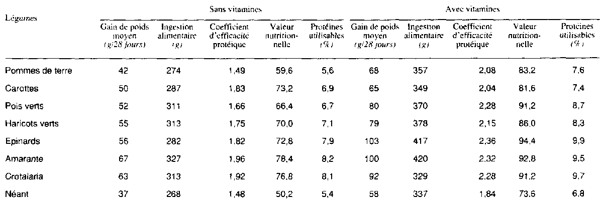 Divers légumes verts destinés à supplémenter les régimes maïs/haricots, ont été décrits: les résultats en sont indiqués au tableau 44. Parmi les légumes étudiés figurent les pommes de terre bouillies, les carottes, les pois verts, les haricots verts, et les feuilles d'épinards, d'amarante et de crotalaria. Deux ensembles de régimes ont été expérimentés, l'un avec vitamines et l'autre sans. L'addition était de 5 pour cent en poids sec. Tous les légumes de l'un et l'autre ensembles de régimes ont amélioré le gain de poids et accru l'ingestion. Les protéines utilisables étaient également plus élevées dans les régimes maïs/haricots, additionnés de légumes verts que dans les régimes témoins, l'utilisation la plus élevée étant obtenue avec les légumes verts en branches. Les valeurs nutritionnelles étaient plus élevées avec l'addition de vitamines que sans. Ces études montrent à l'évidence que l'on peut obtenir une amélioration nutritionnelle des régimes maïs/haricots 87:13 en fournissant des vitamines et en ajoutant des protéines et des acides aminés indispensables.