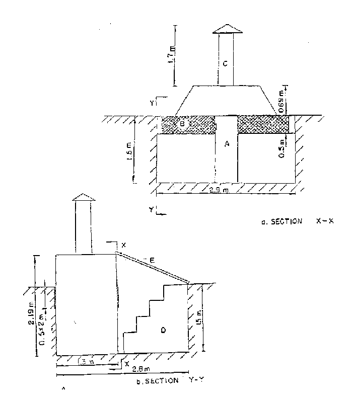 Le Département de Génie rural de l'Université du Nigeria à Nsukka a conçu une cave ventilée pour le stockage des ignames (figure 2.1). La cave mesure 2,90m de long sur 1,30m de large et 1,50m de profondeur. Le toit en forme de coupole protège la cave des eaux d'écoulement de pluie. Des ouvertures de prise d'air grillagées (B sur la figure) et une cheminée (C) située au centre, améliorent le niveau de ventilation. La cheminée, peinte en noir, accentue le mouvement d'écoulement d'air.
