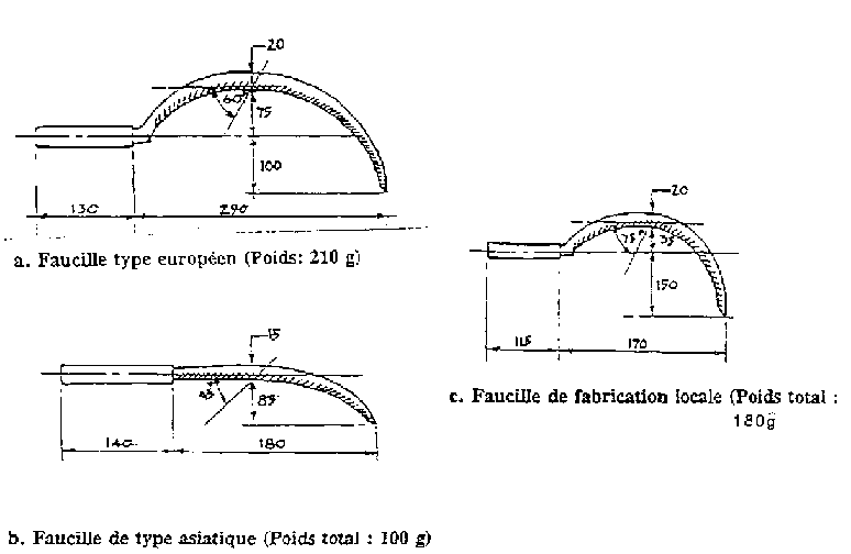 Le projet après-récolte mené par la FAO en Gambie (1992) a introduit la faucille de type asiatique et s'est attaché à former des artisans forgerons capables de fabriquer de telles faucilles (figure 3.2).