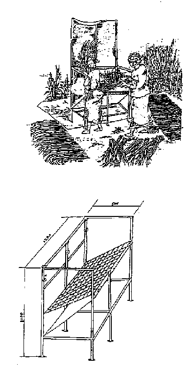 Afin de faciliter le battage du riz à pailles longues sur le lieu même de la récolte, un projet de la FAO a introduit une version modifiée de la table de battage utilisée en Asie, adaptée aux conditions locales (Manalili, 1994). La battage s'effectue en frappant les bottes de pailles contre un réseau de barres maillées formant un treillis incliné (Figure 3.3). On a modifié le modèle en cours de projet en abaissant la table par rapport au sol et en utilisant des branches de neem et de palétuviers, plus résistantes aux termites, pour la fabrication des barreaux. Un modèle métallique, plus solide, a également été construit pour les zones irriguées.
