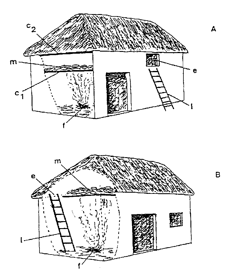 Dans le Nord-Ouest du Cameroun, les épis de maïs partiellement déspathés sont transportés par panier à la maison et placés en couche de 30 à 40 cm à l'intérieur d'une structure appelée "banda.. Le banda est l'espace au-dessus du plafond de la cuisine (figure 4.1). La base du banda qui reçoit les épis est constituée d'un assemblage de tiges de bambou espacées de quelques centimètres, avec une ouverture de 60cm x 60cm permettant l'accès à l'intérieur.