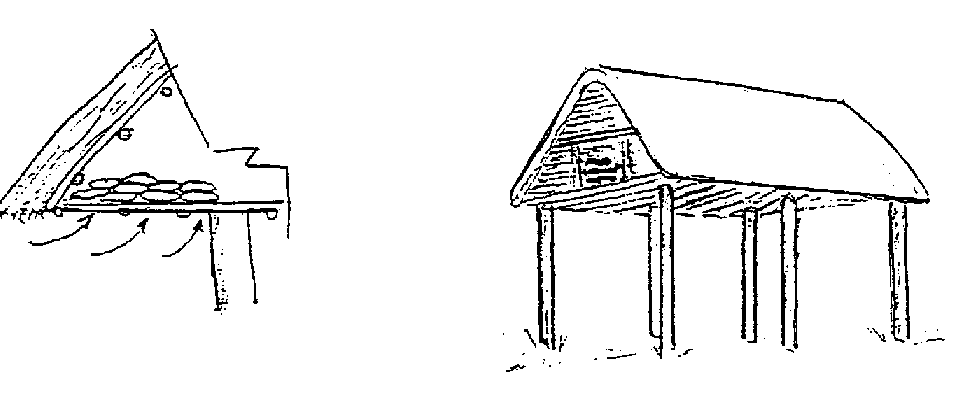Les expériences faites à l'African Rural Storage Centre (Ibadan, Nigeria) ont permis la mise au point d'une structure étroite appelée "crib" (figure 4.5) où le maïs à forte teneur en eau (30%) récolté à maturité peut être conservé convenablement. L'épaisseur du crib ne dépasse pas 60 cm en climat humide si l'on veut éviter les risques d'attaque de moisissures. Les parois sont faites de grillages ou de tiges verticales en bois, en bambou ou en nervures de feuilles de palmier (3 à 5 cm d'épaisseur). Un toit assure une protection supplémentaire contre la pluie.