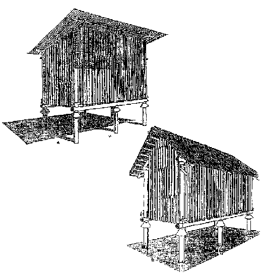 Pour les greniers à section carrée relativement hauts (2,5 à 3m), des entretoises, placées au travers des parois, rigidifient la structure et servent de points d'appui et/ou points d'attache. Lorsque la toiture est fixe, on prévoit une ouverture de 50 x 50cm en moyenne dans la partie supérieure des murs, du côté le moins exposé aux pluies. L'ouverture est placée à mi-hauteur lorsque le toit est amovible.