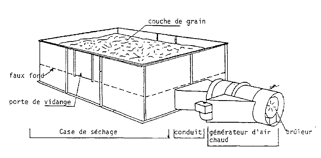 Un modèle de séchoir à air chaud a été mis au point par l'IRRI (figure 4.7). D'une capacité de séchage de 500 à 1OOOkg de grains par jour, il est fabriqué avec des matériaux locaux susceptibles d'être assemblés sur place. Des lots d'épis fraîchement récoltés sont séchés jusqu'à 20% de teneur en eau, puis égrenés. Ensuite le séchage des grain se poursuit jusqu'à un taux d'humidité de 13%.
