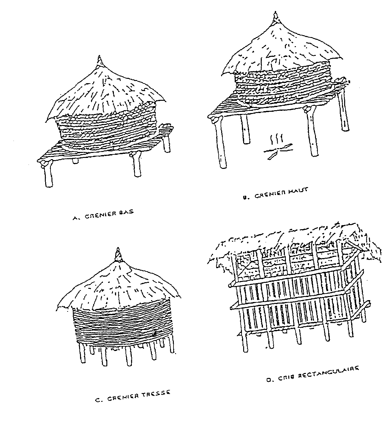Ces "greniers en paille. sont typiques des zones guinéennes et soudano-guinéennes. On les rencontre aussi dans des zones plus séches telles que les zones soudano-sahéliennes. Ils sont utilisés pour le stockage du mil, sorgho et maïs par un grand nombre d'ethnies vivant dans ces zones (figures 5.1).