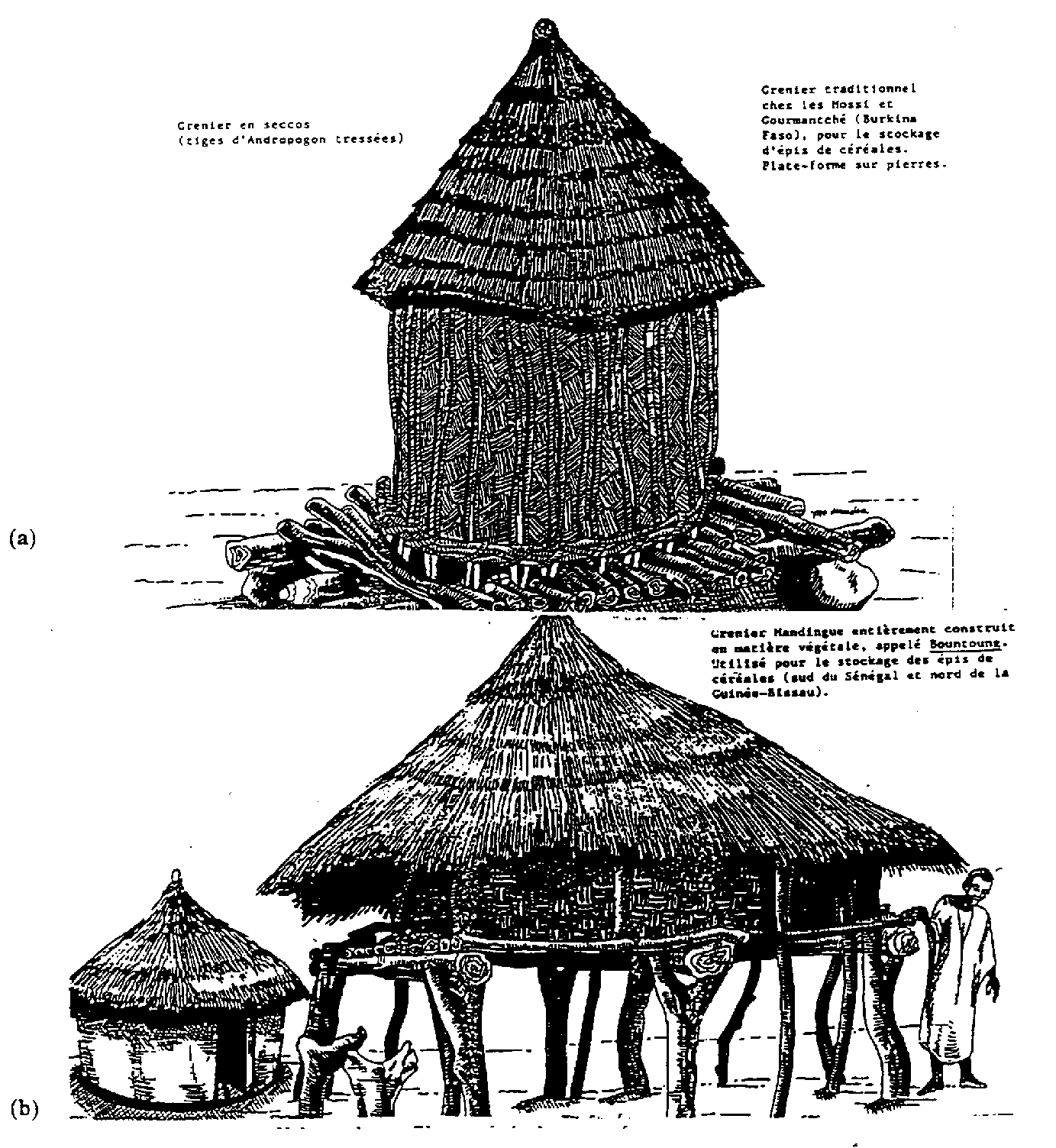 Le but de tout entrepôt à grains est de fournir une protection contre les détériorations dues à la pluie et à l'humidité du sol et de constituer une barrière contre les insectes et les prédateurs vertébrés. En Afrique, on rencontre une importante variété de systèmes après-récolte selon les ethnies et les zones agro-climatiques. De ce fait la première partie du chapitre se limitera à la présentation des pratiques de récolte-séchage-stockage des grains dans les régions soudanosahéliennes d'Afrique de l'Ouest (Grolleaud et Diop, 1987). Puis seront abordées les techniques d'amélioration des structures traditionnelles de stockage. Enfin les cas particuliers des silos et des banques de céréales seront décrits.