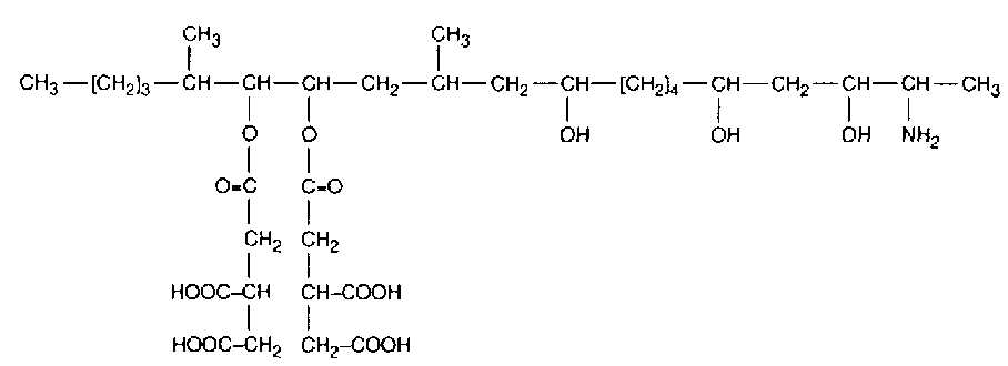 F. moniliforme que cresce no milho pode produzir fumosina B1, suspeito carcinógeno humano. Igualmente a fumosina B1, é tóxica para parcos e aves domésticas, e é causa de leucoencepalomalacia (ELEM), doença fatal em cávalos.