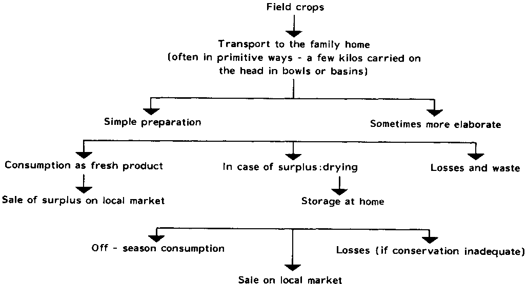Cash crop products for industrial processing and eventual export are generally grown in large, well organised plantations. This applies to coffee, cacao, pineapple etc. Many horticultural products harvest especially garden vegetables, are produced as a family enterprise on small plots of land and with limited resources. These products are essentially grown for domestic consumption. The products that are used for drying are generally the surplus of fresh fruit and vegetables not consumed at harvest time. They constitute a reserve stock for off-season consumption. Small quantities, fresh or dried' not used for domestic consumption' are sold on local markets by women in order to obtain cash. These quantities are generally limited to the weight a woman can carry on her head in a basket, about 10-15 kilos. Most horticultural products are cultivated without the use of draught animals or tractors.