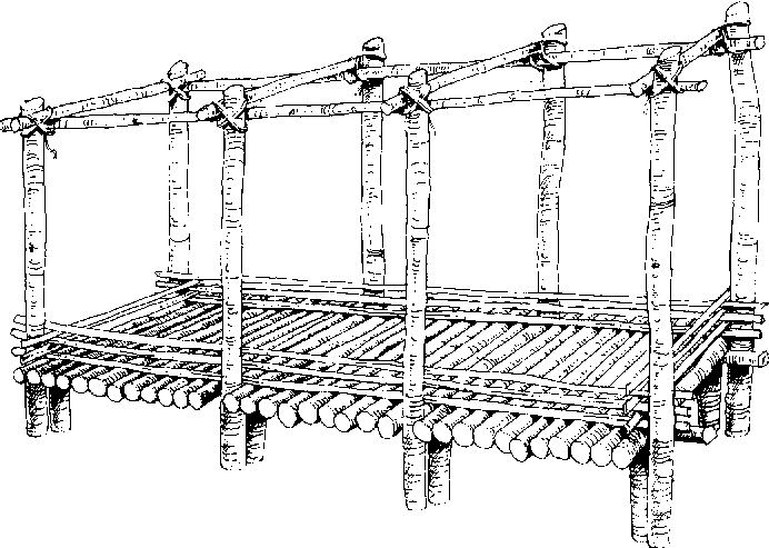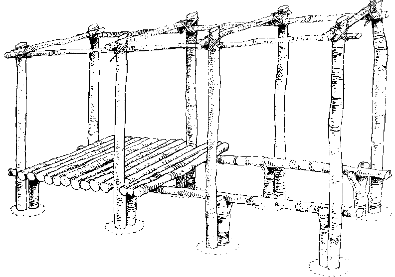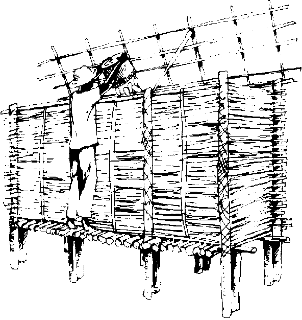 Au lieu des lianes, on peut utiliser des clous pour attacher les eléments des murs et renforcer l'ossature. I l faut 1 kg de clous de 5 cm.