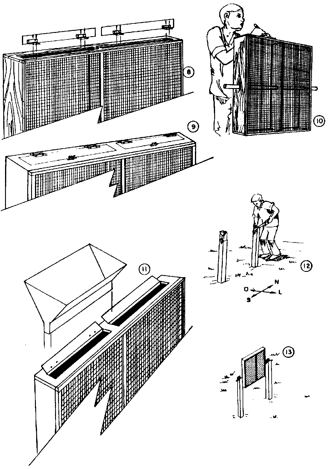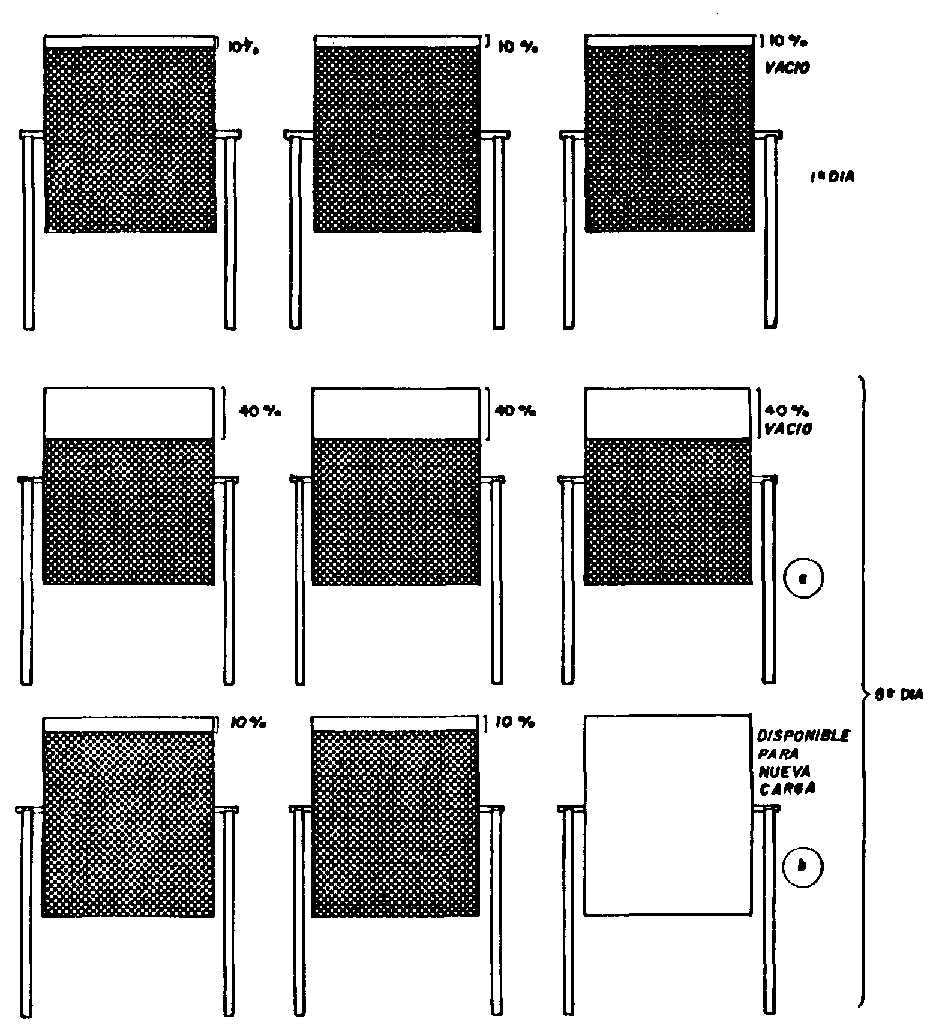 Manejo del secador solar rotativo (figuras 7, 8 y 9). Los granos húmedos se colocan en el secador solar rotativo por medio de un embudo. Los secadores deben colocarse en dirección norte-sur y cambiar su posición cuatro veces al día, como se muestra en las figuras 7 y 8. Antes de poner el secador en la posición indicada, el producto tiene que homogeneizarse por medio de 8 a 10 rotaciones del secador. Este procedimiento se debe llevar a cabo durante el día, siempre que se cambie la posición de los secadores. Durante la noche hay que cubrir el secador con una lona de plástico para impedir el rehumedecimiento del grano y protegerlo de las lluvias.