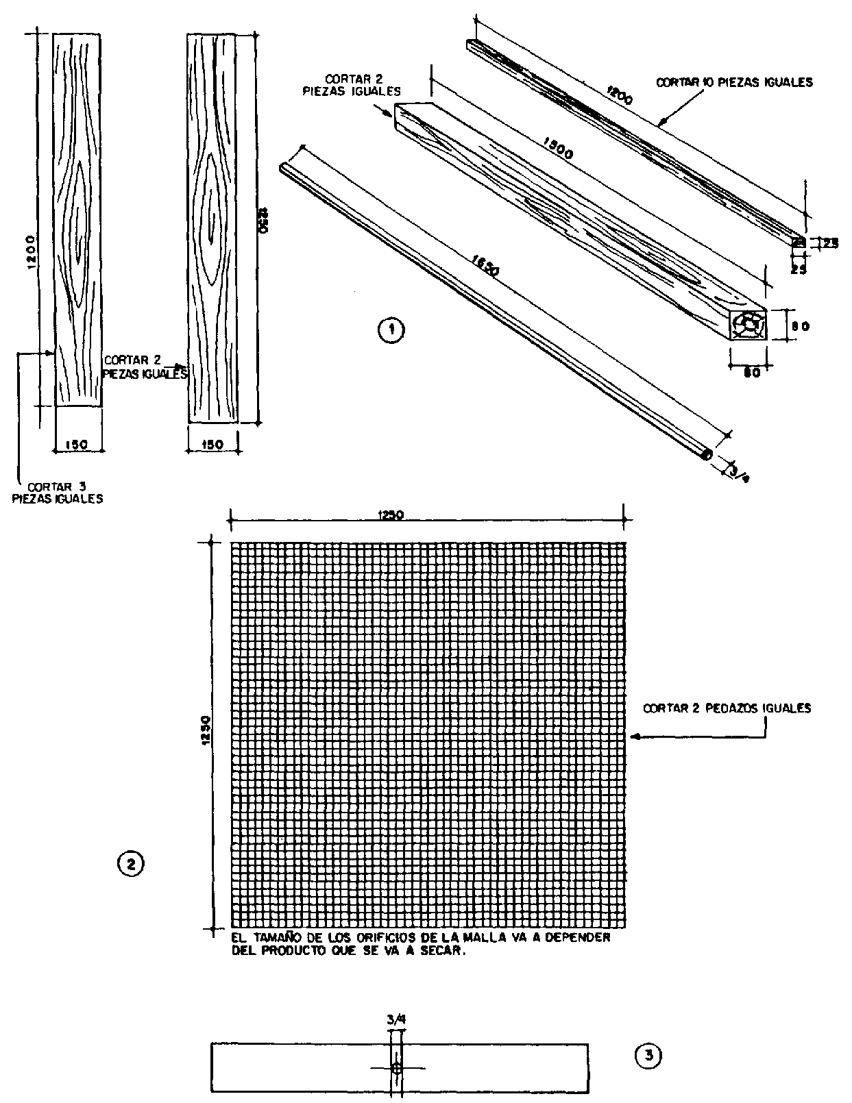 Materiales para el secador solar rotativo. Para un secador solar rotativo de 1,20 x 1,20 x 0,15 m, con capacidad para 200 litros, son necesarios los siguientes materiales: