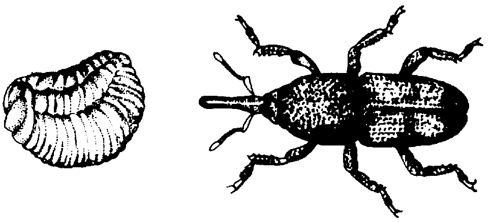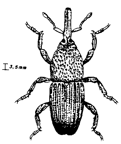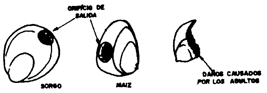 Existen tres especies que son plagas importantes de los cereales almacenados; el gorgojo de los graneros o del trigo, Sitophilus granarius (L.), el gorgojo del maíz, Sitophilus zeumais Motschulsky, y el gorgojo del arroz, Sitophilus orizae (L.). Las especies Sitophilus orizae y Sitophilus zeumais son prácticamente idénticas. Aunque las dos especies pueden encontrarse a menudo atacando el mismo producto, se ha observado que S. zeamais es el principal responsable por las infestaciones que preceden a la cosecha, debido a la mayor tendencia de la especie a volar. Ponen los huevos dentro del grano y la larva, que no tiene patas, hace un túnel y se alimenta en el interior del grano. Desde que la hembra pone los huevos hasta la salida del adulto se requieren de 30 a 40 días, bajo condiciones climáticas favorables. Cada hembra puede poner aproximadamente 300 huevos (figura 7).