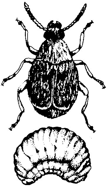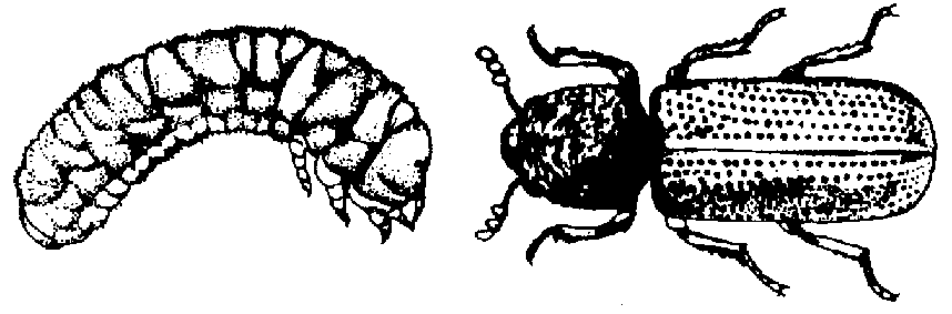 Figura 8. Larva y adulto del pequeño barrenador de los cereales, (Rhyzopertha dominica F.)