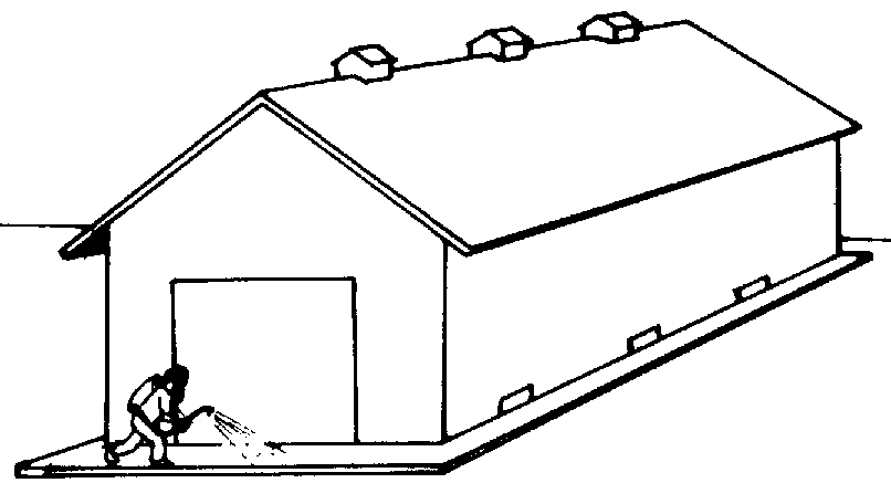 Antes de ocupar nuevamente una unidad de almacenaje se debe limpiar cuidadosamente la parte interna y externa del almacén. En el área alrededor de las instalaciones se debe observar si hay acumulación de granos, depósitos de sacos, hierba alta, aberturas por donde podrían entrar los pájaros y roedores, goteras en el techo y filtraciones en las paredes laterales. Se debe también desinfectar toda el área alrededor de la unidad almacenadora en el período entre cosechas (figura 17).