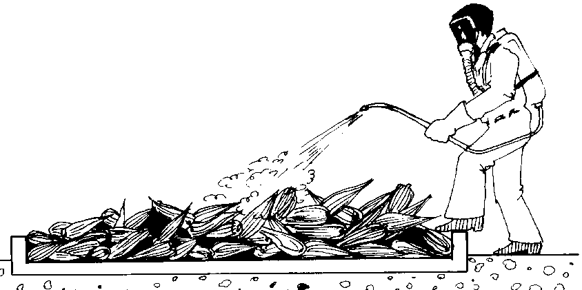 Las pastillas o tabletas del fumigante se distribuyen en un recipiente abierto, en los rincones de la pila. El tiempo de exposición varía de 72 a 120 horas, dependiendo de las condiciones de temperatura: a menor temperatura, debe dejarse más tiempo. Después del tiempo de exposición se deben abrir puertas y ventanas para una mejor eliminación de los gases (cuadro 6).