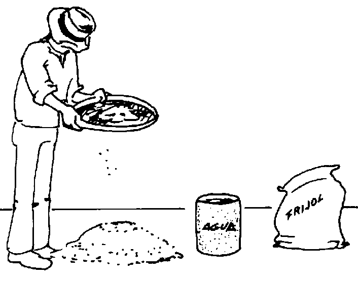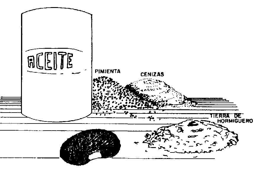 Arena, cenizas y tierra de hormiguero seca. La dosificación es: 1 parte de producto natural por 4 partes de frijol. El producto se mezcla manualmente, cuidando que la arena, la ceniza o la tierra de hormiguero no se depositen en el fondo durante la mezcla. Estos producto matan los insectos por deshidratación, al tapar los conductos respiratorios (figura 49).
