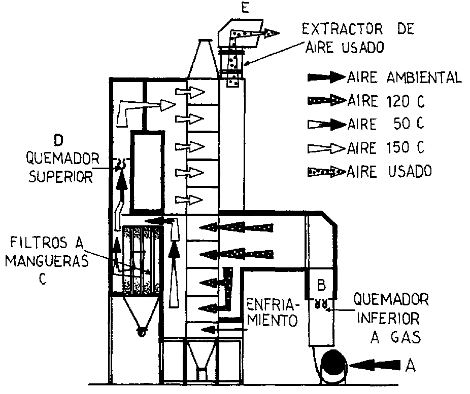 Hay que decir, también, que existen secadoras que tienen varios quemadores a distintas alturas de la torre de secado, y que cada uno suministra una temperatura determinada y uniforme, que van descendiendo desde arriba hacia abajo (Figura 37), situación que favorece una mejor eficiencia de la máquina.