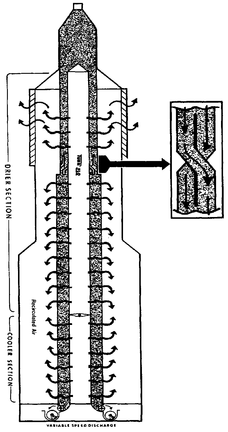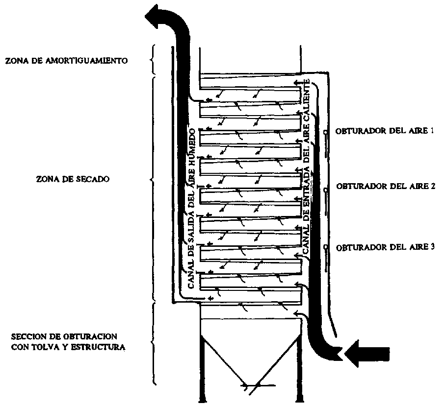 Una secadora de columnas que incorpora varias de las mejoras explicadas en este capítulo y que agrega otras especiales es la que se ilustra en la Figura 53, y que merece ser destacada.
