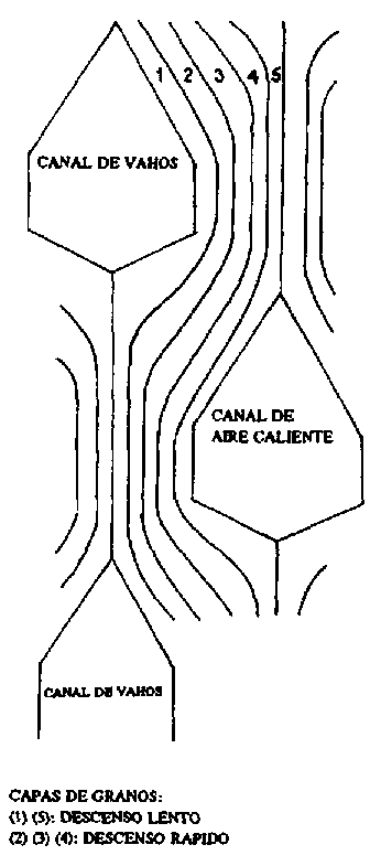 En la Figura 48 se observa una distribución particular de los caballetes, en los que ha podido medirse que las capas de grano I y 5 tienen UD descenso lento, mientras que las capas 2, 3 y 4 tienen un descenso rápido. En los ensayos realizados en la Estación Experimental de Boigneville, del ITCF (ITCF, 1989) encaminados a resolver estos problemas, se ha logrado obtener diseños más satisfactorios, no sólo en la forma de los caballetes sino en su disposición.