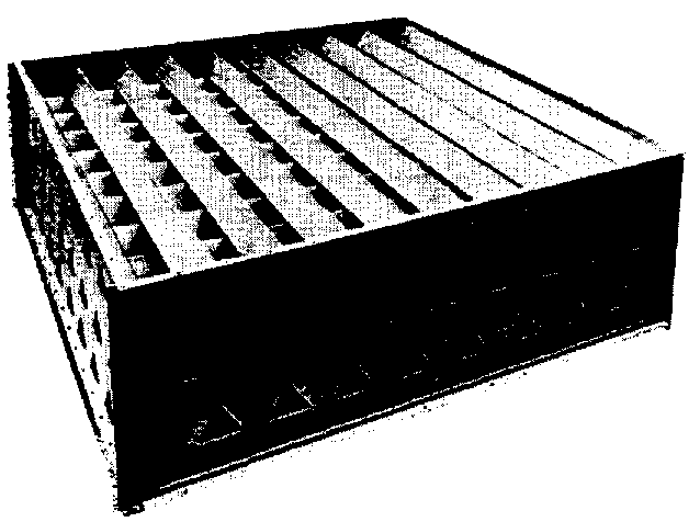 Otra disposición que se ha incluido en algunas secadoras es la posición cruzada de los caballetes (Figura 50). Según sus constructores este diseño separa la masa de granos en capas más delgadas que permiten una mejor mezcla del grano y un contacto más íntimo con el aire, condiciones que originan una máxima uniformidad de secado. También se asegura que esta distribución de caballetes aumenta la rigidez estructural de la torre de granos.