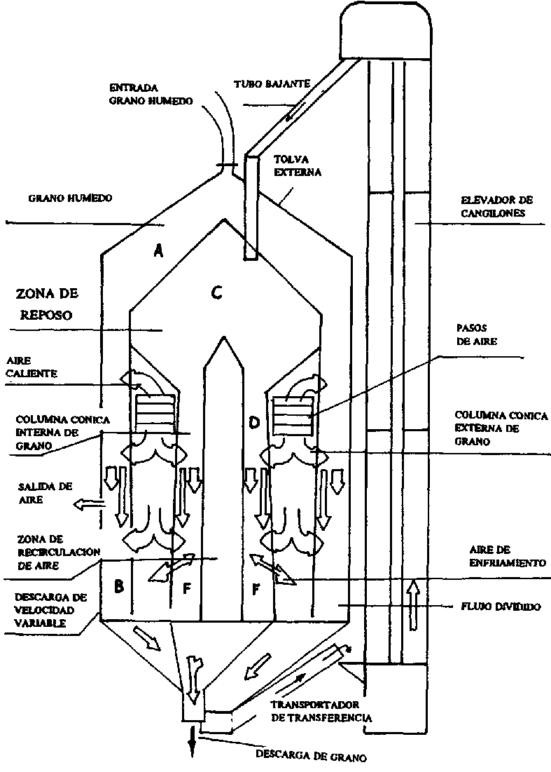 Funciona de la siguiente manera: el grano húmedo ingresa desde arriba y se desliza por las columnas exteriores "A"; columnas se caracterizan por aumentar su espesor de arriba hacia abajo, 30 cm en la parte superior y 40 cm en la parte inferior. Además los rodillos inferiores "B" de descarga tienen velocidades diferenciales, de suerte tal que el grano en contacto con la pared interna y caliente desciende con mayor velocidad que el grano en contacto con la pared externa.