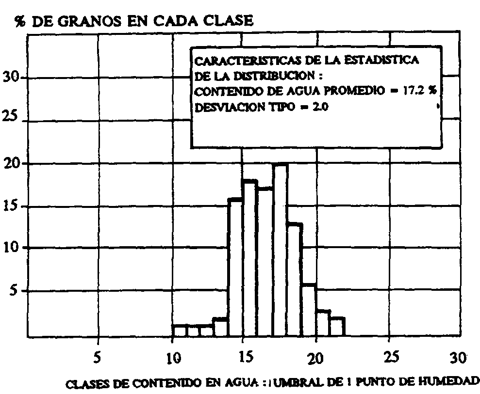 Con los datos de las 100 semillas se puede elaborar UD histograma como el de la Figura 90 que representa a una secadora "mediocre", con UD intervalo tipo de 6,2 puntos de humedad (análisis estadístico). La Figura 91 representa una secadora de comportamiento "medio", con un intervalo tipo de 4 puntos de humedad. La Figura 92 muestra una maquina de mucho mejor comportamiento, con un intervalo tipo de solo 2 puntos.