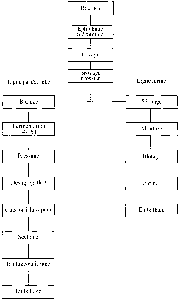 114. Dans la méthode traditionelle, les cossettes de manioc (chips) séchées au soleil sont réduites en farine par pilonnage ou par mouture dans des moulins à marteaux ou à meules. Cette façon de faire est très connue en Afrique, tandis que la fabrication industrielle de farine de manioc est relativement récente. En Côte d'Ivoire, la "Société Bertin" a fourni le matériel installé en 1980 à Toumodi, à 150 km d'Abidjan. Le diagramme de fabrication est donné Fig. 22.