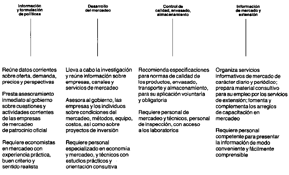 El mercadeo tiene una función estratégica en el desarrollo económico y es indispensable para la agricultura comercial. En consecuencia, merece una constante atención especializada en el marco de la estructura estatal. Las funciones de un departamento de mercadeo estatal abarcan lo siguiente: