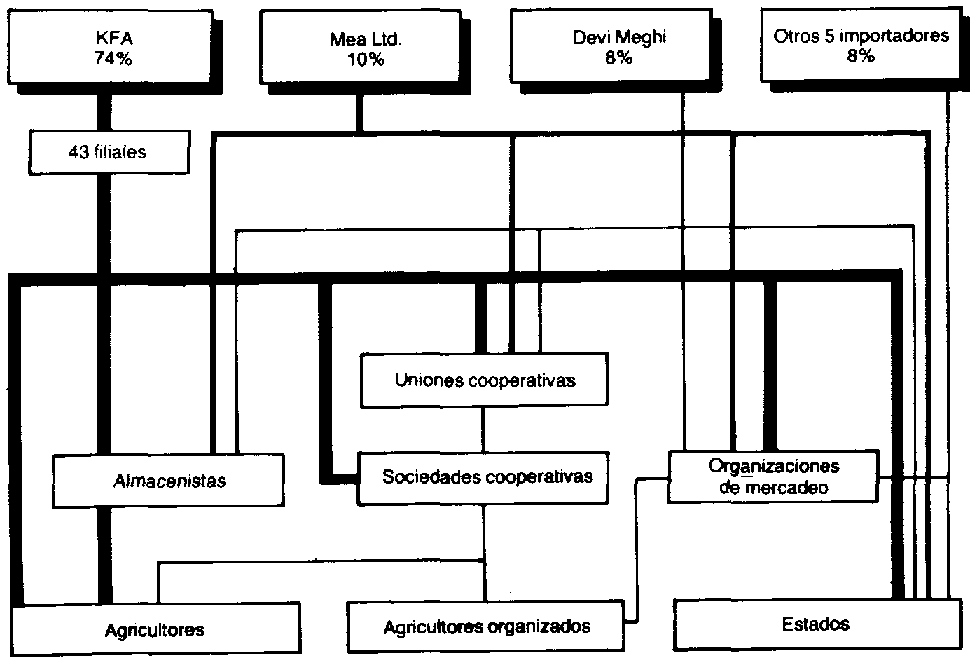 En la India funcionan paralelamente un sistema de cooperativas estatales y canales independientes privados (véase la Figura 3). Se mancomunan los costos de transporte. El Gobierno fija los precios máximos al por menor, pero los dos sistemas quedan en relativa libertad para competir por las ventas. De los 116 500 establecimientos al por menor existentes en 1980, un 35 por ciento era de carácter institucional y un 65 por ciento privado.
