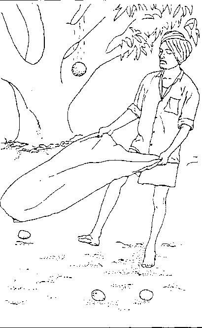Il arrive souvent que les mangues soient cueillies par un cueilleur, monté sur une échelle ou grimpé sur l'arbre, qui jette les fruits à quelqu'un qui est resté en bas (figure 40).