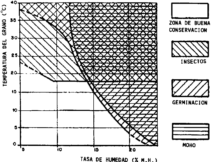 En el diagrama general de conservación, concebido por Burges y Burrel, se establece la relación entre temperatura y contenido de humedad para determinar la zona de influencia de ciertos fenómenos importantes de degradación, tales como el desarrollo de insectos y moho y la germinación de los granos.