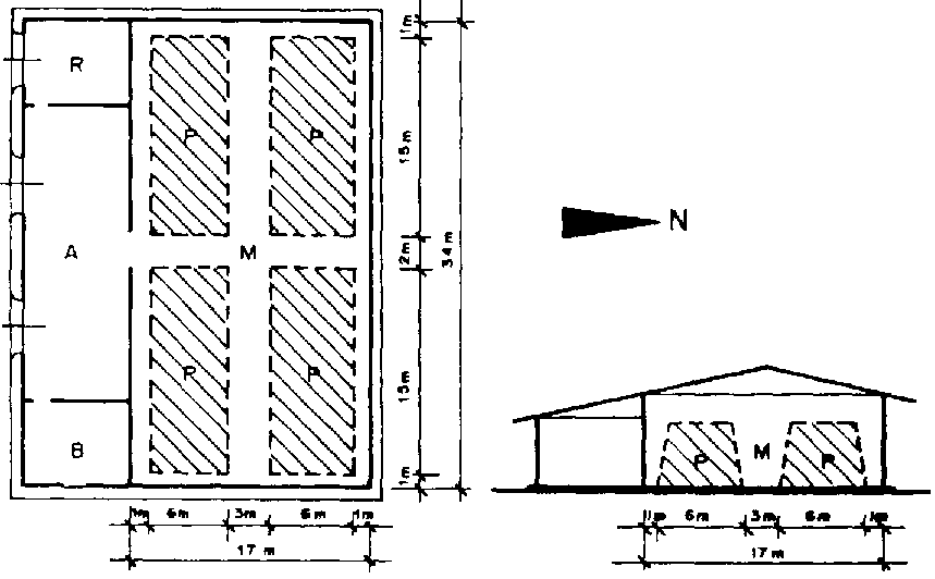 Esquena teórico de un almacén: M Almacén P. Pilas de sacos A Zona de trabajo B Oficina; R Trastero.