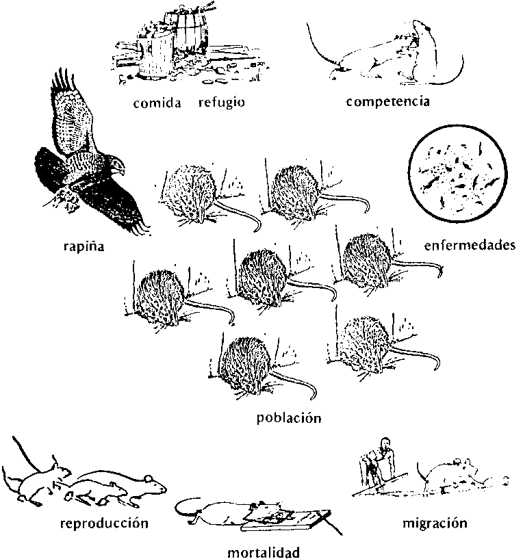 Los factores limitantes de las poblaciones de roedores son comida, refugio, enfermedades, competencia y rapiña. Las poblaciones se modifican por reproducción, mortalidad y migración (Figura 12). Nacen más roedores de los que pueden sobrevivir. El número de roedores que un área determinada puede sostener esté limitado por el medio ambiente.