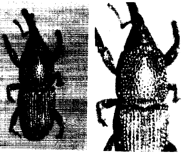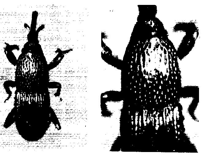 Los gorgojos del arroz y del maíz son de apariencia muy similar, el protórax esta densamente cubierto de depresiones circulares. Los élitros presentan cuatro manchas de color amarillento (Figura 45).