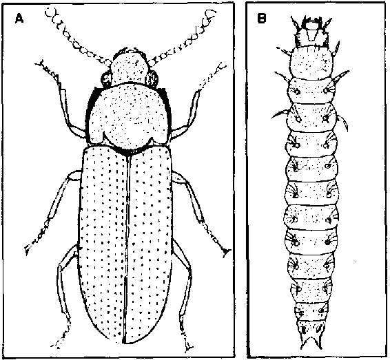 BIOLOGIA. La hembra ovipone aproximadamente 300 huevos en un periodo de 10 semanas, entre los productos que ataca. Los huevos eclosionan dando origen a pequeñas larvas delgadas con 3 pares de patas, de color cremoso, con dos manchas ligeramente más oscuras en cada uno de los segmentos. La larva madura construye un capullo en el que pasa la fase de pupa. El adulto no es capaz de volar, es longevo y puede llegar a vivir hasta 3 años. Los hábitos y ciclo biológico de las dos especies son similares; pueden desarrollarse a una temperatura de 16,5 a 37,5° C y una H.R. de 10 a 90%. Su ciclo biológico demora de 20 a 25 días a una temperatura de 30 a 35° C y H.R. de 70 a 90%.