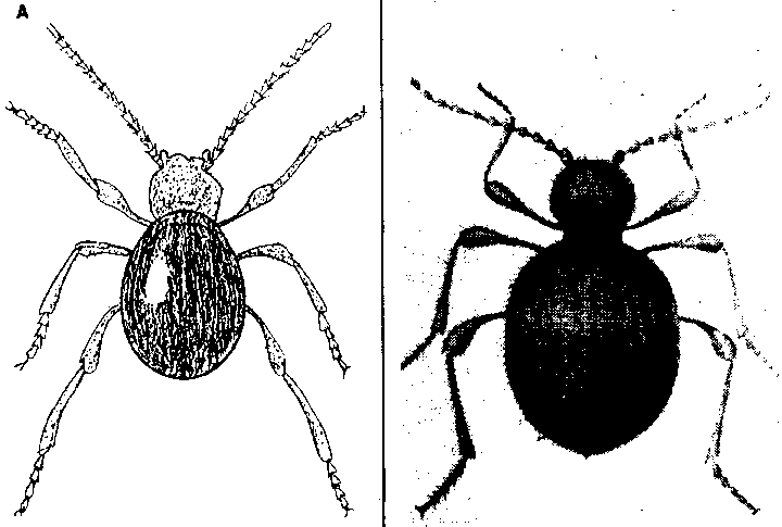 OTRAS ESPECIES DE LA FAMILIA PTINIDAE. Otros gorgojos araña comúnmente encontrados en productos almacenados son Gibbium psylloides (Czenpinski), de cuerpo más bien globular cuyos élitros y protórax son lisos, brillantes y sin vellocidades. Mezium affine Boieldieu y M. americanum (Laporte), son de apariencia similar, pero tienen el protórax densamente cubierto de vellocidades. Otro insecto de cuerpo globular es el gorgojo araña dorado Niptus hololeucus (Fardermann), que se caracteriza porque tanto los élitros como el protórax están densamente cubiertos de vellocidades amarillo doradas. Otras especies reportadas son Ptinus clavipes Panzer (antes P. hirtellus Sturm), P. Iatro (Boieldieu), P. exulans Erichson, P. fur (L.) (antes P. Iatro F.), P. incisicollis Pic, P. japonicus Reitter, P. Iatefasciatus Gorham, P. raptor Sturm y P. villiger Reitter. En climas templados o fríos de Estados Unidos, Canadá, Colombia, Perú, Chile y Argentina, es coman en residuos de granos y sus productos, Trigonopenius globulus Solier (Figura 58).