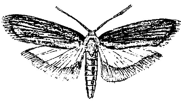 DESCRIPCION. Los adultos miden de 7 a 13 mm con las alas extendidas, alas anteriores de color canela claro, sin manchas visibles aunque las venas se notan ligeramente oscurecidas. Alas posteriores anchas, terminando en una punta roma, transparentes, con la venación muy visible y rodeada de una banda de pequeños pelos. Palpos labiales rectos. Los machos generalmente son más pequeños que las hembras. (Figura 77).