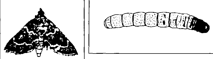Figura 81. Palomilla o polilla de los alimentos, Pyralis farinalis Linnaeus. Adulto y larva.