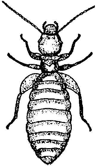 Los adultos son pequeños, miden de 0.5 a 0.8 mm de longitud, por lo general carecen de alas; su cabeza es grande con antenas largas y filiformes, tórax pequeño, especialmente el protórax, abdomen ancho, segmentado y más largo que el resto del cuerpo que es semitransparente, gris pálido o amarillento, aunque se han encontrado especies de color oscuro. (Figura 83).